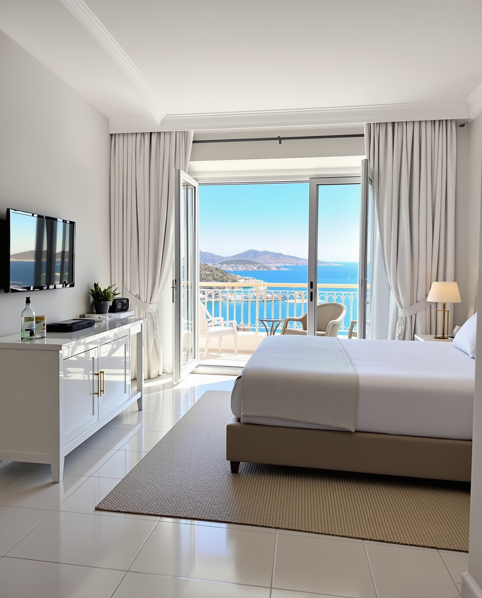 French balkon veya teraslı, deniz ve şehir manzaralı. Klima, LCD TV ve çay-kahve seti dahil.