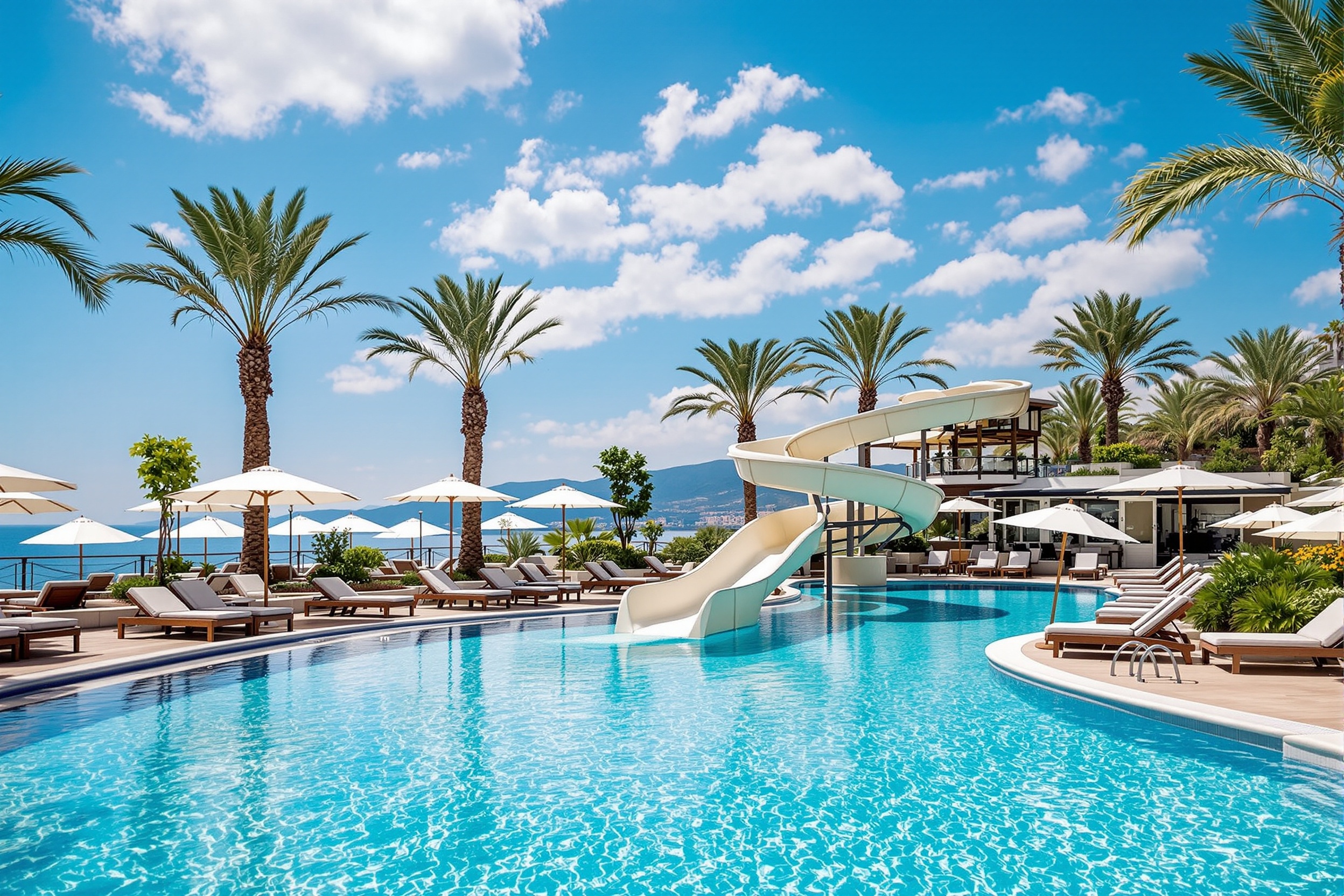 Türkuaz suları, su kaydırağı ve şezlong alanı ile güneşin tadını çıkarın.